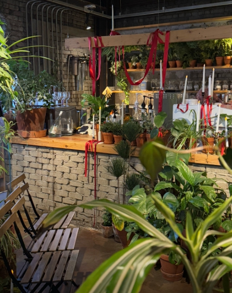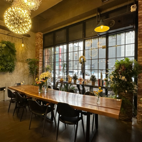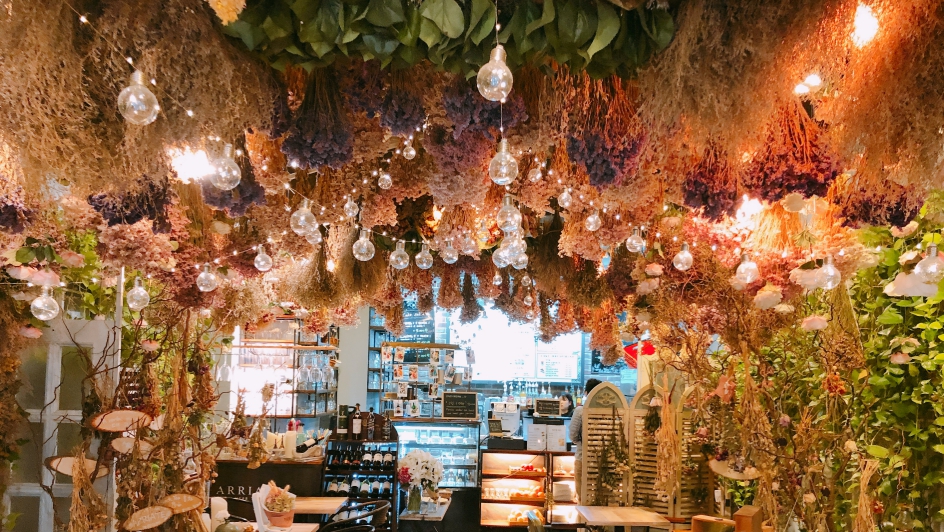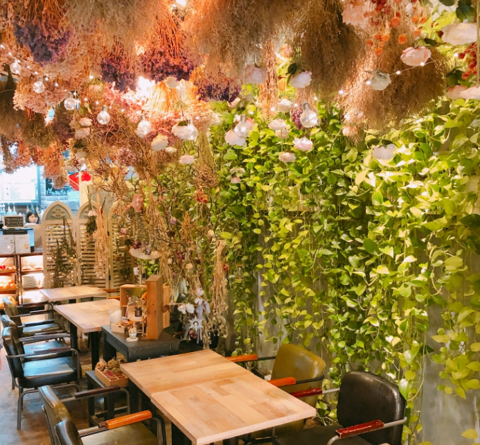 천장부터 벽면까지 화사한 꽃과 식물 장식으로 둘러싸인 플라워 카페는 발렌타인데이 인증샷에 제격입니다. 식물향기 가득한 공간에서 차 한 잔 즐기는 시간도 힐링이 되죠.