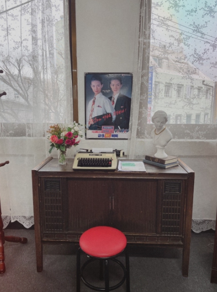 옛날 교실 책상·의자, 오래된 사진기나 라디오 등의 빈티지 소품이 카페 곳곳을 채워 특별한 느낌을 줍니다. 사진 찍으면 필름 카메라로 찍은 듯한 감성이 살아나 발렌타인데이 추억으로 딱이죠.
